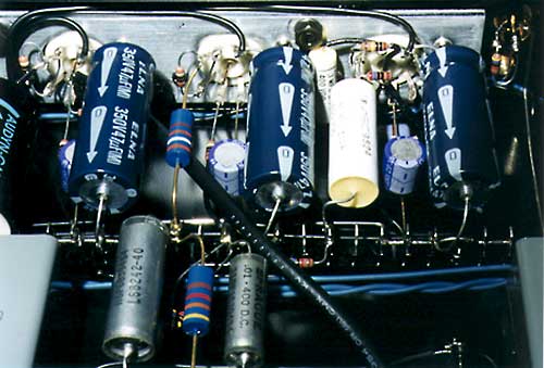 ![]() 画面右端にフォノ入力。その近くのソケット周辺はミュードライブのため込み入っている。RIAA素子のCはスプラグのフィルム型。 ![]() 別筐体の電源部。側板を外して電圧調整できるフレキシブル構造。 |