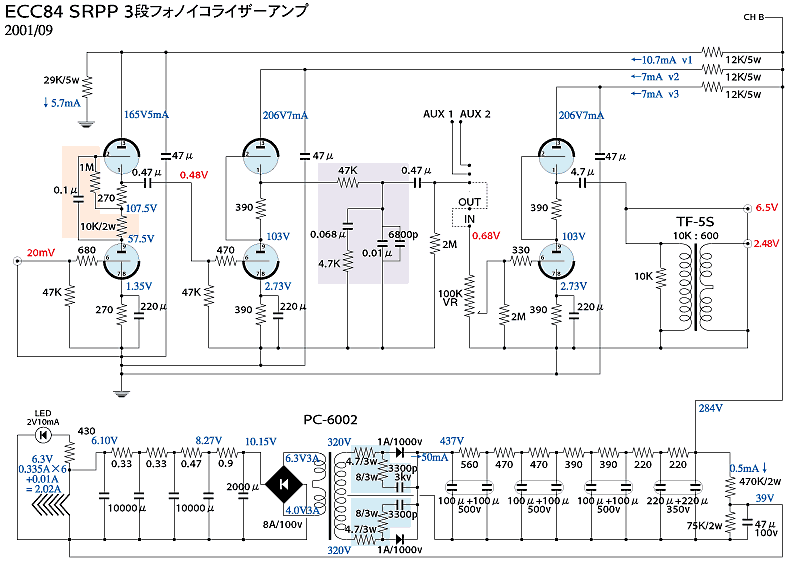 回路構成: トータルゲインを確保すべく初段をμドライブSRPP(回路図ベージュの部分)を採用。微細信号の欠落を少しでも防ぐためRIAA素子は2段目の後に挿入し、なおかつコンデンサ素子のリニアリティ向上のためDCバイアスを掛けた状態で動作させる(うす紫部分)構成ですが、問題は2段目入力がオーバーレベルになる危険性です。初段が理想どおり24倍のゲインを持っていると仮定し、2段目のグリッド電位から逆算すると、初段の最大入力は約80mV・・・基準値5mV/1kHzを0dBとすると、RIAAカーブでは高域14kHzで16.6dB増加しますので、ちょっと少ない気もしますが、ディスクの高域端にこんな高レベルの信号が刻まれているケースは少ないと勝手な判断をしました。 RIAA素子の定数は、前段の出力インピーダンスと後段の負荷抵抗値に密接に関わりますし、無帰還CR型は高域の出力インピーダンスが大幅に下るので、この辺の考慮も必要。また、素子をDCバイアス上に置いた場合、定数が若干変わるという報告が、宍戸さんの著作にありました。要は一筋縄ではいかないと言うことで、スピーカを負荷にしたネットワーク設計と似ていると言えなくもありません。大抵はロールオフ用Cは計算値より大きなものが必要だったりします。今回のケースでは、直列の47Kは聴感上のスペクトラムバランスからこの値に決定したものですし、ロールオフ用Cに足した6800pfも同様です。 RIAA素子は100Kオーム*のボリュームが負荷となり3段目へ入ります。2段目と3段目は同一動作のオペレーションになっていますが、歪み打ち消しを狙ったものではありません。入力レベルがほぼ同等といった観点からこのようになりました。OUTPUTはカソード出力からDCカット用4.7μを経て取り出しています。同時に10K/600オームのマッチングトランスを介した出力を装備しています。(*現在、50Kのボリュームを試用中です。) 電源部: B電源、ヒータともにダイオード整流で交流分の残留を極度に排除する構成ですが、チョークもレギュレータも使っていません。B電源で8段、ヒータで4段におよぶR/Cフィルタという野蛮なものです。またトランスとダイオード間にはスナバー回路(うす青部分)を装着しスパイクノイズの駆除を目論んでいます。ヒーター回路はSRPPの定石としてDCバイアスを与えています。 ・ 下に最終的な回路を示します。表示電圧・電流は実測値です。初段はμ値と同等の増幅率を示し、μドライブの面目を保ちました。また、全段とも規定にほぼ準じた数値を示していて、ECC84のバラツキのなさを実感します。 |