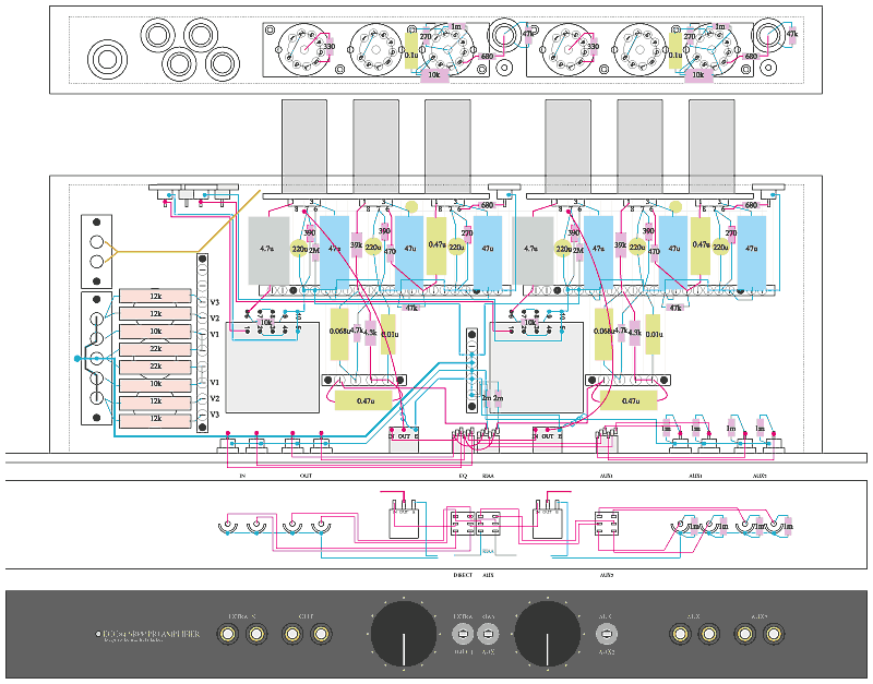 | 全体構造: SN比の徹底追及という面から電源部は別筐体とし、本体はマークレビンソンJC2のような薄型構造とします。本当は電源込みの一体型で、さりげなくお洒落に作りたいものですが、持てる技術と求める音との兼ね合いで、このような野暮な形態になってしまいました。チューブの取り付け方は、かつてのアルテックのプリアンプ1567のように、後方に水平に突き出す構造になっています。フォノ入力端子は初段管のグリッド間近に設置、ハイレベル入力はフロントパネルのセレクタswに隣接した位置とします。さらに、常用しているパラメトリックEQを挿入するための入出力端子(テープモニタ)も加えることにしました。 |