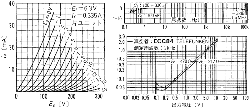 ECC84のEP/IP特性(左)SRPPの周波数特性(右)SRPPの出力対歪率特性(右下)MJ1993年4月号執筆の森川忠勇氏のご承諾を得て掲載します。 |