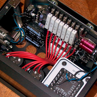 製作: パーツサイズを実測しMac上でシミュレートしつつ設計しました。特にアース配線はループを形成しないように配慮した1点アースになっています。反省点としては、パーツに即して厳密なレイアウトをすると、あとで変更するときに大変な困難を伴う・・・これは身にしみました。是枝氏の作品に見られるような見事なレイアウトは、バラックセットで推敲を重ねた後の成果なのでしょうね。 ケースは本体、電源ともタカチのオールアルミ製の既製品を使用していますが、パネル文字はMacで製作したデータをフィルム出力の上、シルクスクリーンで印刷しています。ボリュームノブは気に入ったものが無く、国産のレオスタット型を削り直して使用。C/R素子にオーディオ用高級品は要所にしか使っていません。カソードパスコンにMJのアンプコンテストの賞品でもらったOSコンがちょうど使えたのがラッキー。チューブは初段がテレフンケン、その他がムラード製となっています。 なおECC84/SRPPはミドルμとはいえ、高域レンジが100kHzまでフラットに伸びているため寄生振動に注意する必要があります。3段目のグリッド・シリーズの330オームは、やや数値が足りないようで球によっては発振寸前のケースがありました。現在のところは球の選別でしのいでいます。 |