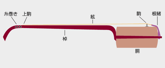 | ●三味線の不思議「サワリ」を考察する。 どんな楽器でも、特にプリミティブな構造のものほど、ひとつの要素が響かせる音を大きく変化させます。三味線の構造は、皮を貼った胴体とそれを貫通する棹のふたつが主な構成要素です。張られた絃が通過(接触)する部分は、棹の延長上に取り付けられたシンプルな糸巻き、上駒(ギターでいうとナットですね)、駒(ブリッジ)、そして絃を留める根緒、これは絹糸を堅く編んだ組み紐状のもので、胴体を貫通する棹の末端に固定されています。振動循環系としては極めて明解な損失の少ない構造といえます。 |
