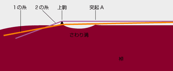 使われているマテリアルの固有の響きのコントロールは重要で、花梨材の胴体は内部に杉綾と呼ばれる細かい溝を彫り、共鳴音の単純化を嫌っています。この響きの単純化というのは古今東西の楽器制作者にとって、もっとも避けるべきことのようでして・・・。付随して言うと、棹は「紅木」という極めて硬度の高いインドマドラス地方の灌木を用いるのですが、一本分を削りだしたあと、通常は3つに分割されます。この分割面は複雑な構造の「ほぞ」で繋いで、もう一度結合されます。ほぞの内面は金の薄板を介しています。なぜこんな面倒な仕掛けになっているのでしょう?バラバラにして小さな鞄で運べるメリットでしょうか。プロの演奏家はたいてい長いままケースに入れて運びます。私見ですが、硬度の高い、内部損失のすくないマテリアルの固有の共振を押さえながら、振動モードの分散化、複雑化を意図しているのだと考えます。 もうひとつ、そして最大の複雑化はなんといっても「サワリ」ではないでしょうか。「サワリ」は構造であり現象であるのですが、1の糸(最低音絃)のみ上駒を通さずに、意図的にビリつかせる仕組みです。 |