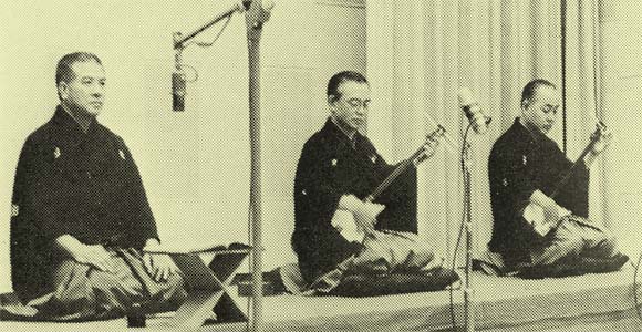 休題2 長唄研究家の浅川玉兎氏の著書「長唄の基礎研究」(昭和37年改訂版)は、歴史的考察、楽理研究および諸流派の現況などを盛り込んだ格好の入門書ですが、こと録音分野では放送について若干の記述があるものの、レコードに関しては稽古における利用法解説の他は、まったく触れられていません。 三味線音楽におけるレコードの位置が舞踊の音源としての用途であったり、稽古のお手本であったりと、要は実用の域を出るものではなかったといった当時の事情を反映しているものと考えます。 このページは、芳村伊十郎の録音記録からその芸質の変遷を辿るという観点で構成している関係から、年代検証は可能なかぎり正確を期したいと願っています。しかしながらレコード自体に録音年代が記されないという業界の習慣、またこの方面の参考文献が少ないという事情もありまして、ある部分、推定でしか示せない部分が何カ所か発生しています。 もしご不審な点や誤りがあるようでしたら、何なりとお申し付けください。 休題3 ちょっとオーディオ方向に振った話になりますが、「二人椀久」のCD盤で気がついたことを少々・・・。 LP盤では、A面は♪粋なこころではらがたつわいな・・で終わり、B面は♪仔細らしげに・・から始まります。問題はB面の音質が芳しくない、ささくれだったもので、騒ぎ唄のタマの後半から一層、線の細いヒステリックな響きになっていることです。 ニューシリーズのCD盤は前記のとおり素晴らしい出来映えで、比べるとLP盤の音は濁っているのが明確にわかります。後半の音質の変化もかなり修正されていますが、テープのドロップアウトがはっきり確認できます。この件はLP盤でもわずかに感じられたということから、テープの経年変化ではなく、オリジナルテープで発生していたと考えられます。通常この位のトラブルが発生すれば没テークになるはずですが、演奏の優劣とトレードオフしたのかもしれません。 LP盤の音が濁っている原因はCD盤を聴いてある程度分かりました。それは三味線のエコー成分が原因で、一般的にスタジオ録音ではエコー成分を電気的に付加するのですが、この演奏のケースでは、かなりノイズ的なパルスとして加えられています。どうしてこのようなエコーになったのか不明ですが、多分オペレーションミスではないでしょうか。 三味線の直接音は現時点で考えてもかなりハイクラスのクオリティで、長十郎の三味線の堅牢な質感をリアルに捉えています。CDではきれいに分離して聴こえるのが、LPでは渾然一体となって濁り気味になったというわけです。 以上枝葉の話にスペースを消費し申し訳ありませんでした(笑)。 スタジオ風景の写真は日本コロムビア「長唄追補十番」の解説本より使用させていただきました。 日本コロムビア株式会社様に謹んでお礼申し上げます。 |