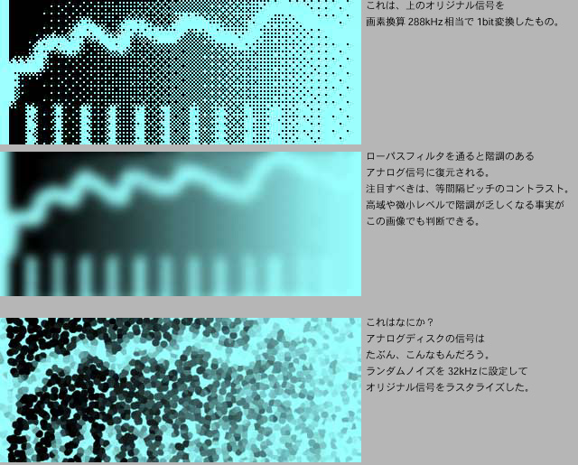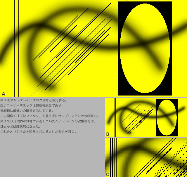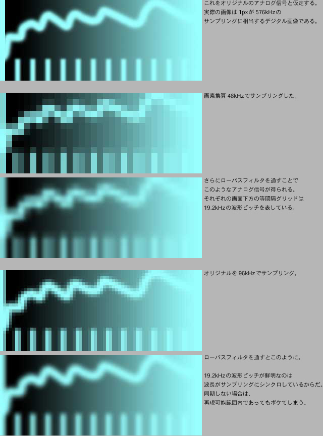というわけで、第一章をフィルタリングなんていう、地味なところから始めてしまったので、今回はサンプリングとポストフィルタの関係を、例によって画像によるシミュレーションでお伝えしたい。これを見るとCDフォーマットが人間の識別境界付近に設定されている、という現実を分かっていただけると思う。ちなみにこれらの解説図版は概念図の範疇ではあっても、スケール(サンプリングと画像ピクセルの関係)は正確を期しているし、意図的なレタッチなども行っていない。
